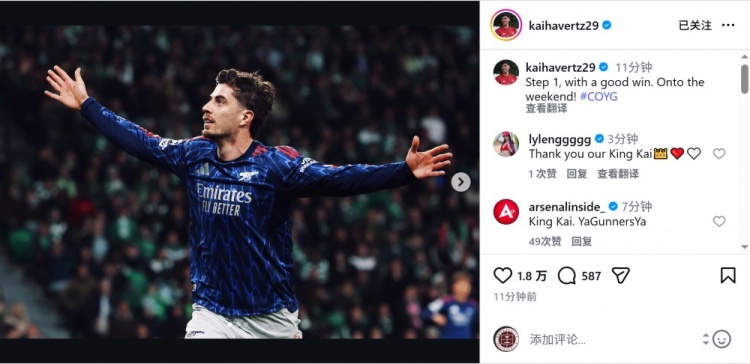 哈弗茨社媒晒出庆祝得分 的照片,配文:“第一步,拿下一场美妙的获胜 ,周末见!”