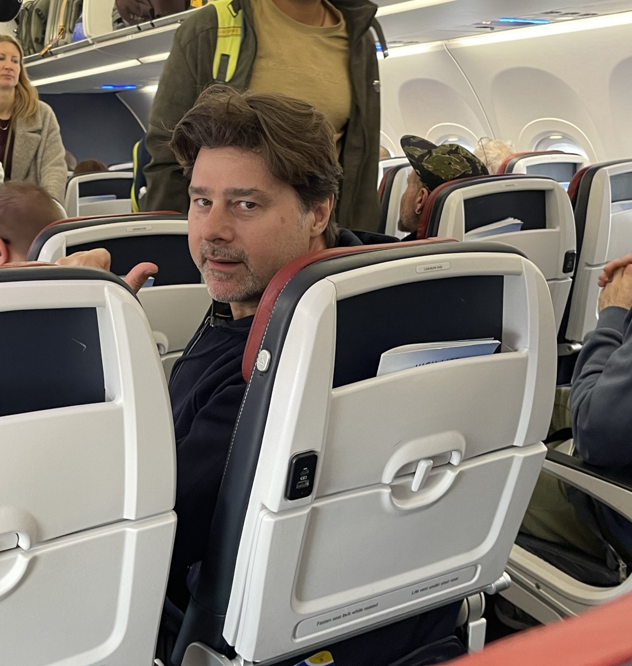 机上的足球观众高唱波切蒂诺之歌,后者举手致意。
